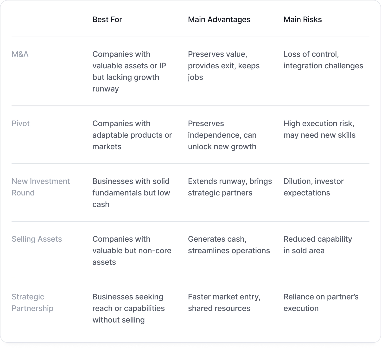 The best alternative to dissolution depends on your assets, market conditions, and personal goals as a founder. Each option has its advantages and trade-offs: