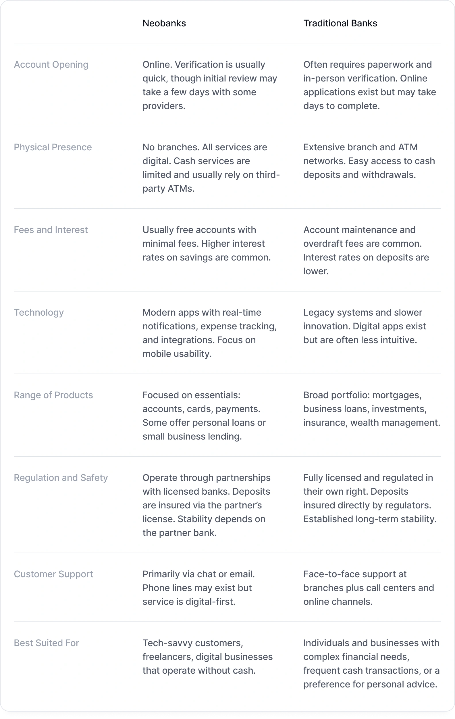 To better understand the real differences, let’s look at how neobanks and traditional banks approach the fundamentals. Neobanks emphasize speed, low cost, and digital convenience, while traditional banks offer stability, a wider range of services, and personal support.