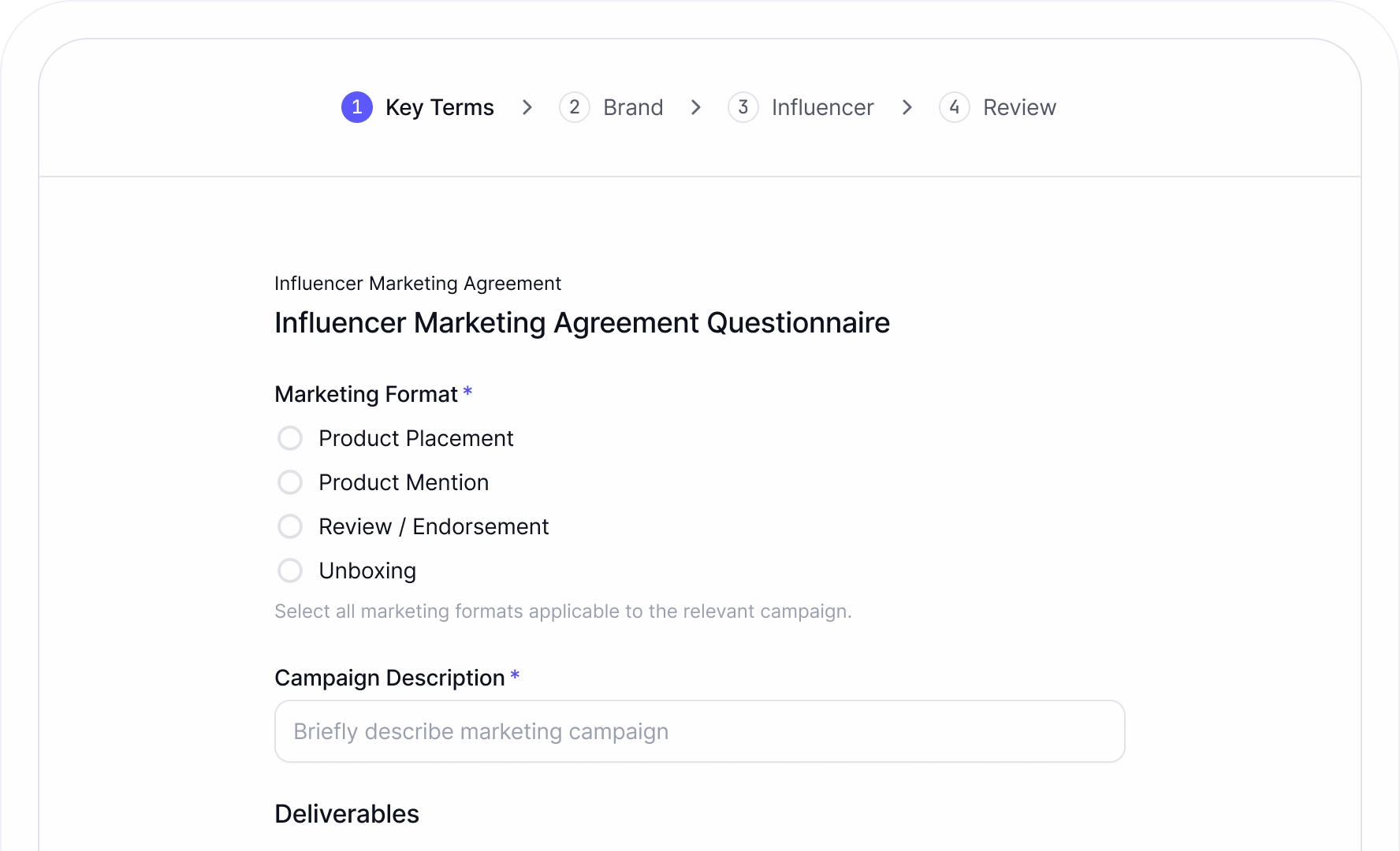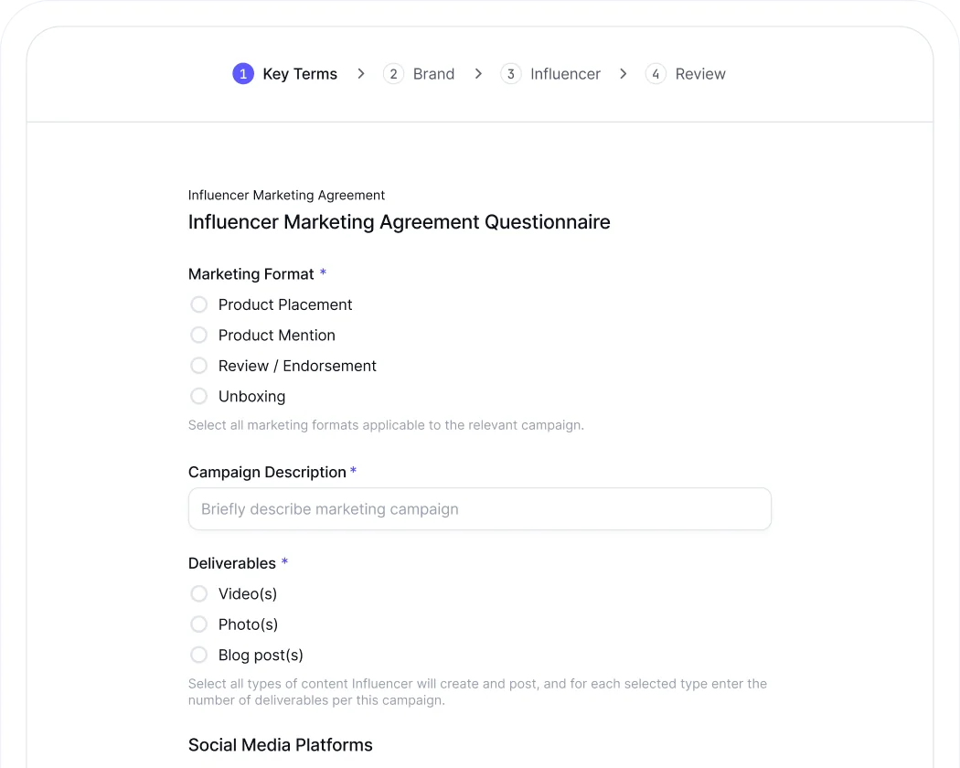 Like every Skala template, the Influencer Marketing Agreement walks you through key terms with built-in guidance: